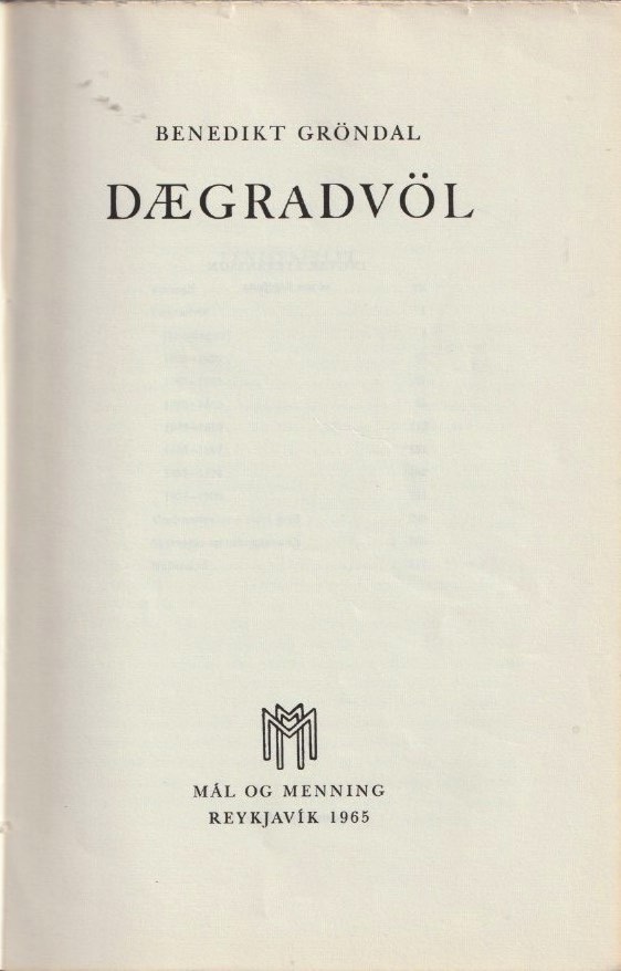 Dægradvöl. Sjálfsævisaga Benedikts Gröndals. Bókin er saumuð, límd og sett í kápu. Stærð: 22.7 X 14.5 cm og 338 bls. Kápa: Gísli Björnsson, en mynd er af frumteikningu Ben. Gröndals.