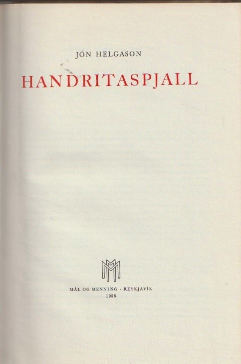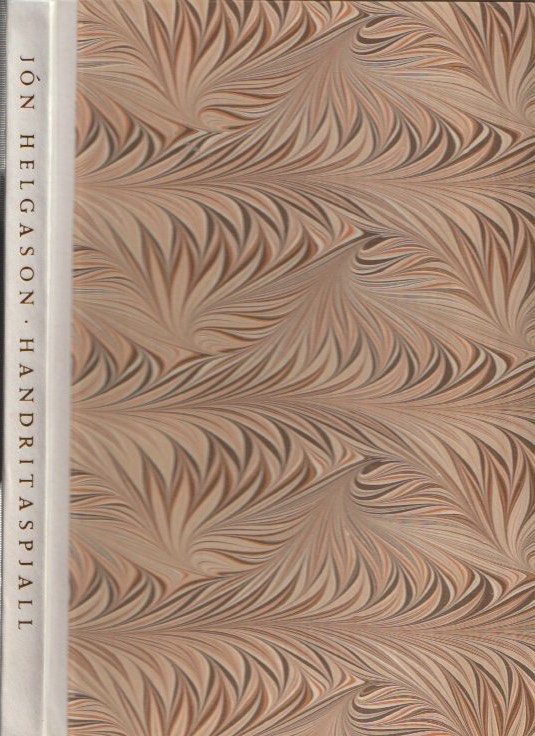 Handritaspjall eftir Jón Helgason handritafræðing í Kaupmannahöfn. Hér er samankominn fjölbreyttur fróðleikur um helstu handrit Íslendinga, sem geymd voru í Árnasafni í Kaupmannahöfn og víðar. Bókin er saumuð og bundin í gott forlagsband, shirting á kjöl eða hvítt rexín. Spjaldapappír er prentaður eftir handgerðum marmor pappír.