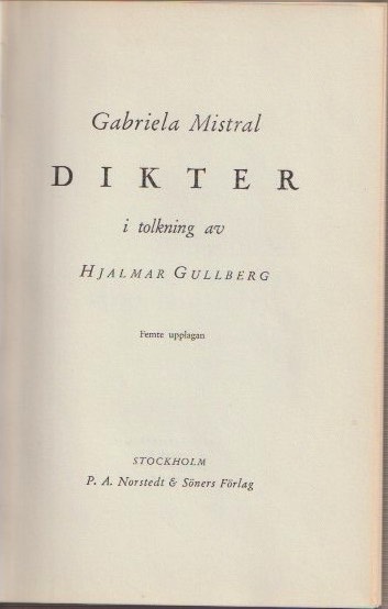 Gabriela Mistral DIKTER i tolkning av Hjalmar Gullberg. Femte upplagan. Bókin er bundin í forlagsband. Hvítan bókbandsshirting alband, og gyllt á kjöl og rós á framspjald. Stærð: 18.2 x 12.5 cm og 89 bls.