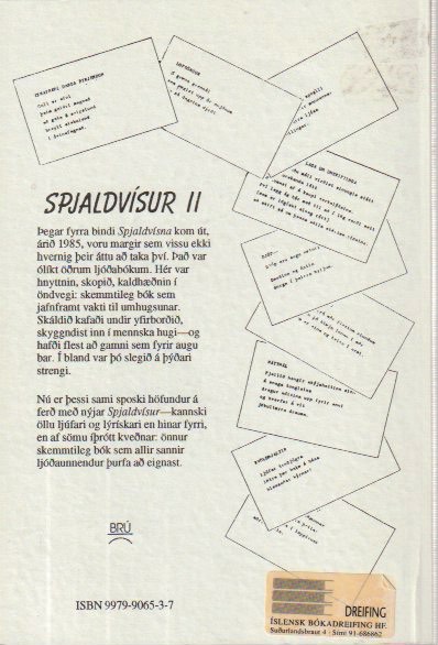 Spjaldvísur II Ljóðabók eftir Hallberg Hallmmundsson, sjá baksíðu á kápu. Bókin er kilja, stærð: 20 x 13.5 cm og 90 bls. Frá bókinni er sagt á bakkápu. Höfundur hannaði flestar bækur sínar sjálfur.